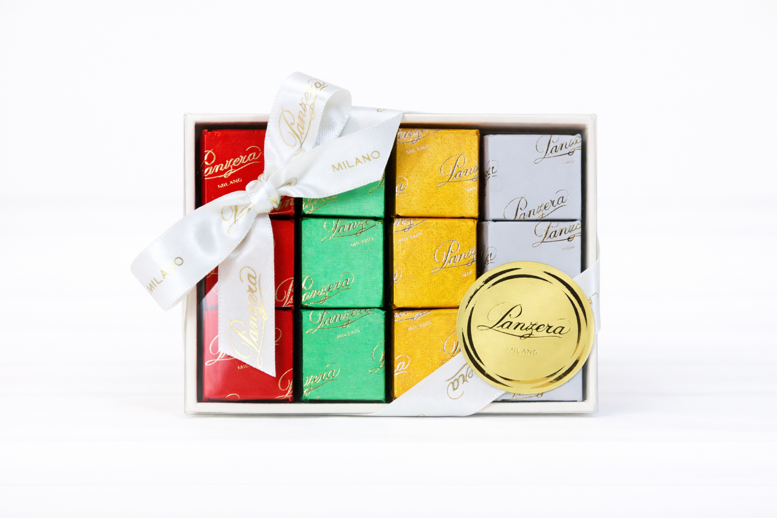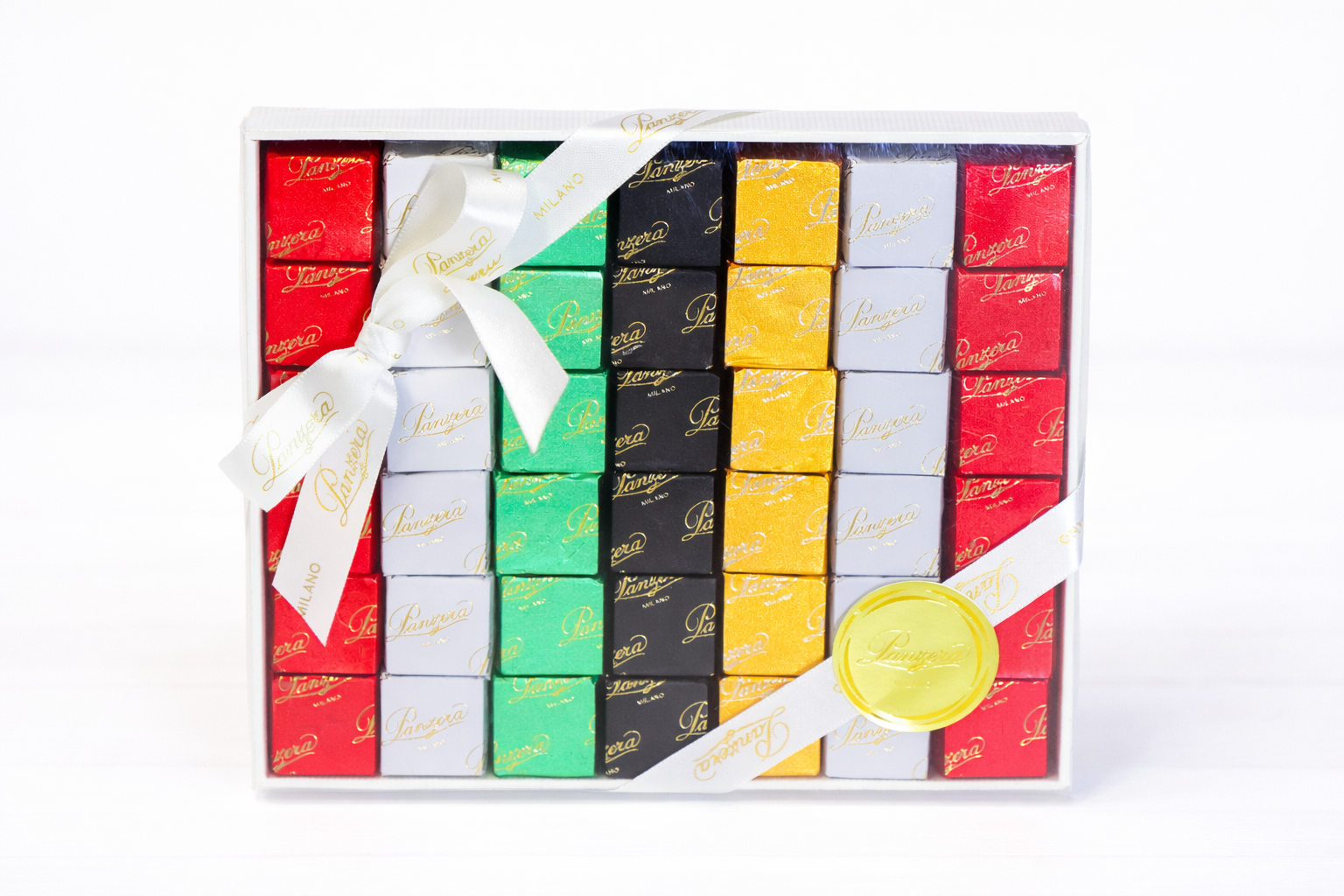 Assortimento dei nostri 5 tipi di cremini: Gianduja al Latte (incarto bianco), Gianduja Fondente (incarto nero), Pistacchio (incarto verde), Lampone (incarto rosso), Cappuccino (incarto oro)